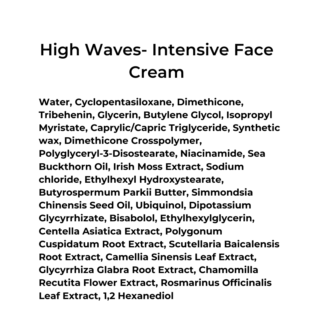 Water, Cyclopentasiloxane, Dimethicone, Tribehenin, Glycerin, Butylene Glycol, Isopropyl Myristate, Caprylic/Capric Triglyceride, Synthetic wax, Dimethicone Crosspolymer, Polyglyceryl-3-Disostearate, Niacinamide, Sea Buckthorn Oil, Irish Moss Extract, Sodium chloride, Ethylhexyl Hydroxystearate, Butyrospermum Parkii Butter, Simmondsia Chinensis Seed Oil, Ubiquinol, Dipotassium Glycyrrhizate, Bisabolol, Ethylhexylglycerin, Centella Asiatica Extract, Polygonum Cuspidatum Root Extract, Scutellaria Baicalensis Root Extract, Camellia Sinensis Leaf Extract, Glycyrrhiza Glabra Root Extract, Chamomilla Recutita Flower Extract, Rosmarinus Officinalis Leaf Extract, 1,2 Hexanediol