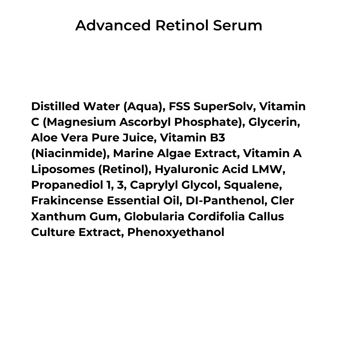 Distilled Water (Aqua), FSS SuperSolv, Vitamin C (Magnesium Ascorbyl Phosphate), Glycerin, Aloe Vera Pure Juice, Vitamin B3 (Niacinmide), Marine Algae Extract, Vitamin A Liposomes (Retinol), Hyaluronic Acid LMW, Propanediol 1, 3, Caprylyl Glycol, Squalene, Frakincense Essential Oil, DI-Panthenol, Cler Xanthum Gum, Globularia Cordifolia Callus Culture Extract, Phenoxyethanol