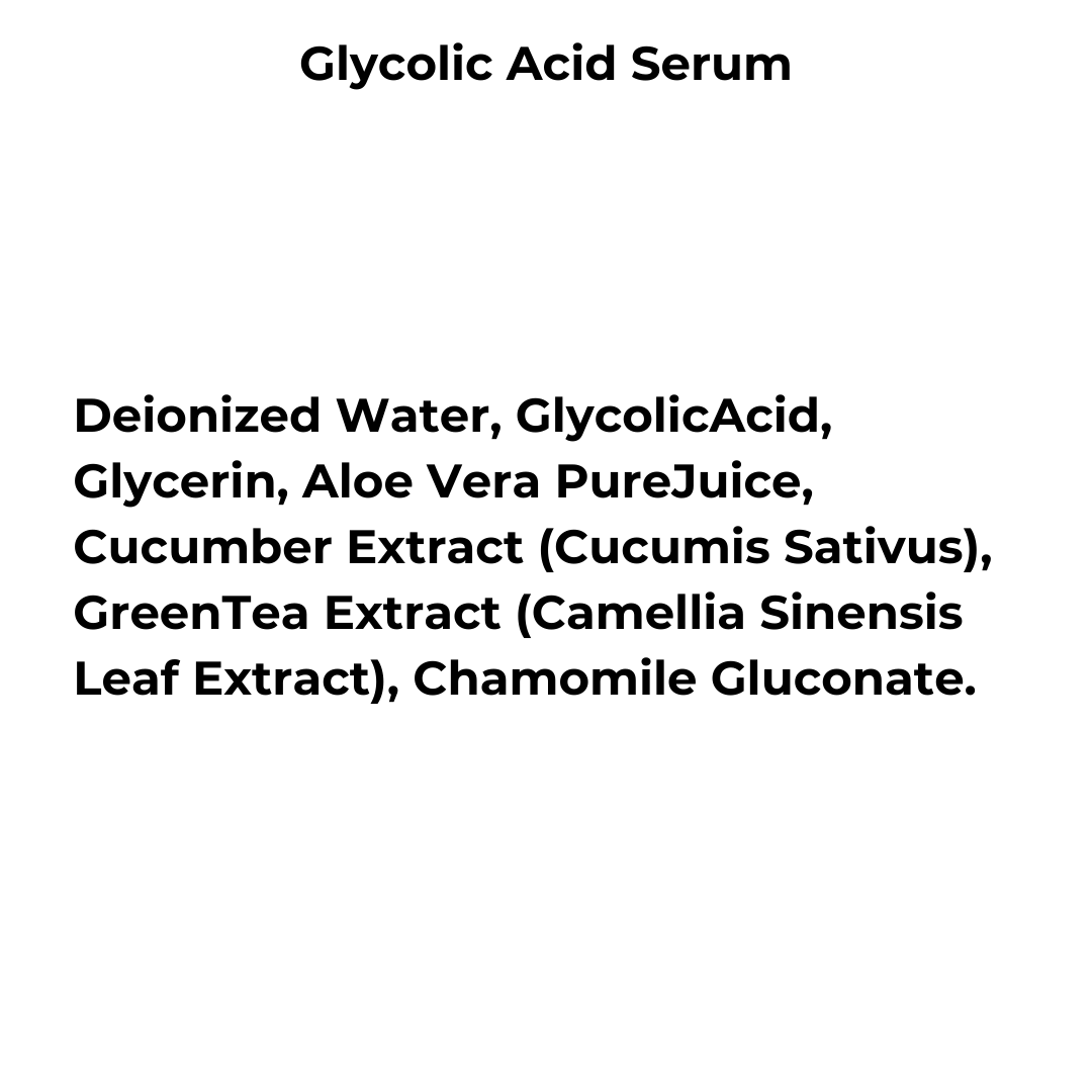 Deionized Water, GlycolicAcid, Glycerin, Aloe Vera PureJuice, Cucumber Extract (Cucumis Sativus), GreenTea Extract (Camellia Sinensis Leaf Extract), Chamomile Gluconate.