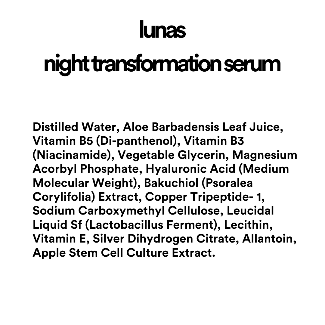 Distilled Water, Aloe Barbadensis Leaf Juice, Vitamin B5 (Di-panthenol), Vitamin B3 (Niacinamide), Vegetable Glycerin, Magnesium Acorbyl Phosphate, Hyaluronic Acid (Medium Molecular Weight), Bakuchiol (Psoralea Corylifolia) Extract, Copper Tripeptide- 1, Sodium Carboxymethyl Cellulose, Leucidal Liquid Sf (Lactobacillus Ferment), Lecithin, Vitamin E, Silver Dihydrogen Citrate, Allantoin, Apple Stem Cell Culture Extract.